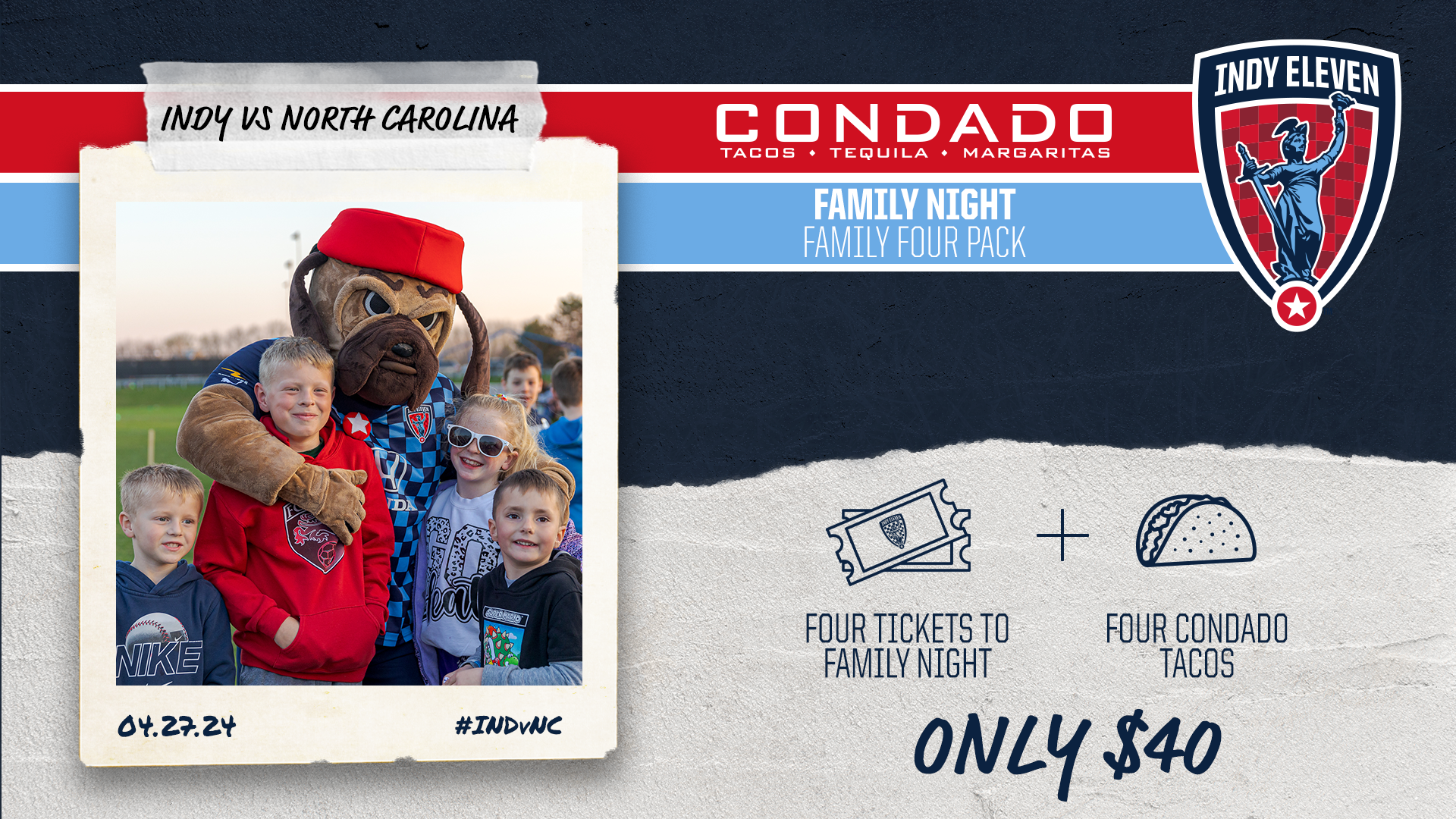 Tickets and tacos for the fam! Purchase a Family Four Pack of tickets for Indy Eleven’s match on April 27 and receive vouchers to get four (4) free tacos at any Condado location.