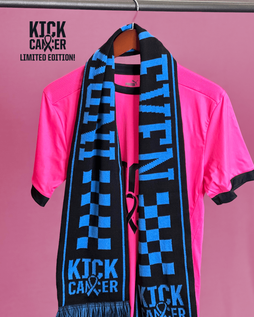 Be sure to grab the Merch of the Match the Kick Cancer Cancer themed fan warm-up and scarf! A portion of the proceeds of the merch will be donated to Camp Kesem.