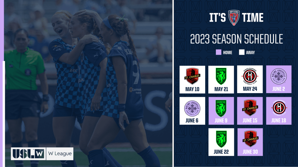 The season starts with a trio of away affairs across the month of May, starting on Wednesday, May 10, with a trip to the Saint Louis area to take on St. Charles FC. The Girls in Blue then get to finish the season with five of seven matches at their Grand Park Events Center home during a jam-packed month of June, starting with a rivalry row against Racing Louisville FC on Friday, June 2.