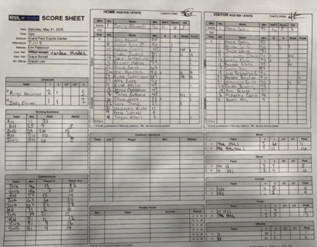 After Kings Hammer scored to take a 3-1 lead in the 86th minute, Indy Eleven responded quickly with midfielder Olivia Joyce delivering a long shot from outside the area to score her first goal off an assist from Bahr to bring her team to within 3-2.
