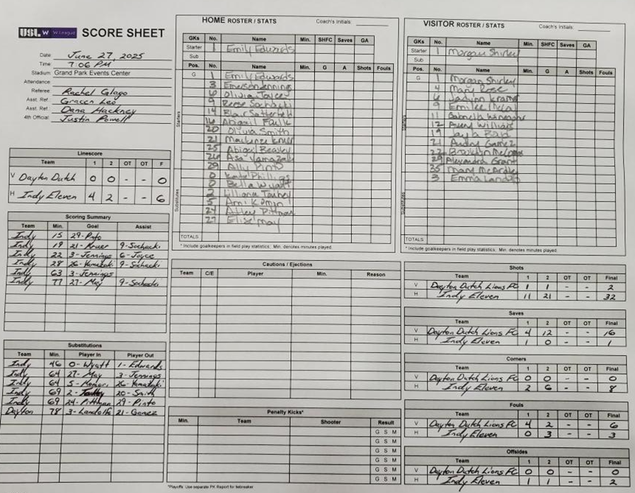 Indy Eleven line-up: Emily Edwards (captain) (Bella Wyatt 46’), Abby Foulk, Abby Beasley, Mackenzie Kruer, Blair Satterfield, Ally Pinto (Atley Pittman 69’), Asa Yamazaki (Ami Komori 64’), Olivia Smith (Lilly Touhey 69’), Emersen Jennings (Elise May 64’), Reese Sochacki, Olivia Joyce.
