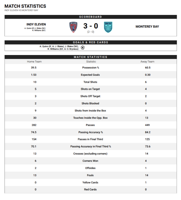 Indianapolis — In a commanding performance at home, Indy Eleven powered past Monterey Bay FC with a 3-0 victory, backed by a strong attacking display and a clean sheet from goalkeeper Hunter Sulte. Goals from Aodhan Quinn, Jack Blake, and Romario Williams sealed the win, as the Boys in Blue continue their climb up the USL Championship Eastern Conference standings.