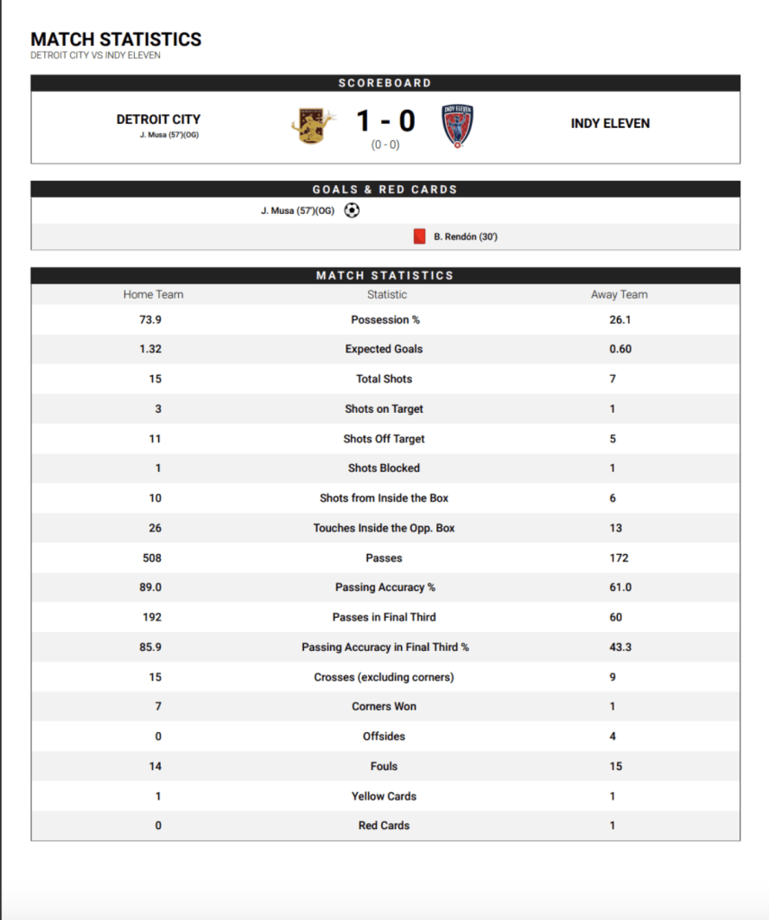 Indy Eleven was reduced to 10 players in the 29th minute following a red card. Despite the setback, the squad stayed organized and disciplined, keeping Detroit City off the board until an own goal in the 57th minute. That is the first goal Indy Eleven has given up in four matches all-time at Detroit City FC.