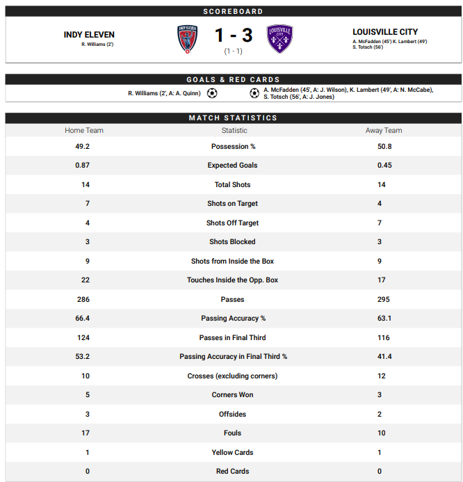 Indianapolis – Indy Eleven jumped out to an early lead, but USL Championship Eastern Conference leader Louisville City FC responded to earn a 3-1 win in front of 10,0230 fans at Carroll Stadium.