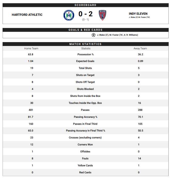Hartford, Conn. – Indy Eleven recorded its fifth clean sheet of the season to earn a huge 2-0 road victory at USL Championship Eastern Conference opponent Hartford Athletic on Wednesday night.