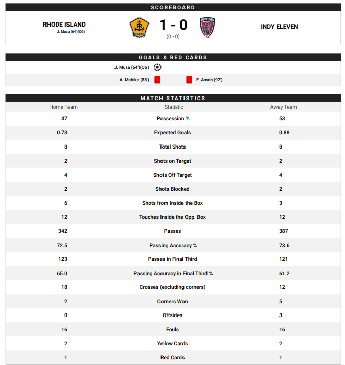 Indy Eleven 0:1 Rhode Island FC - Sat., Sept. 13, 2025 – 7:00 p.m.