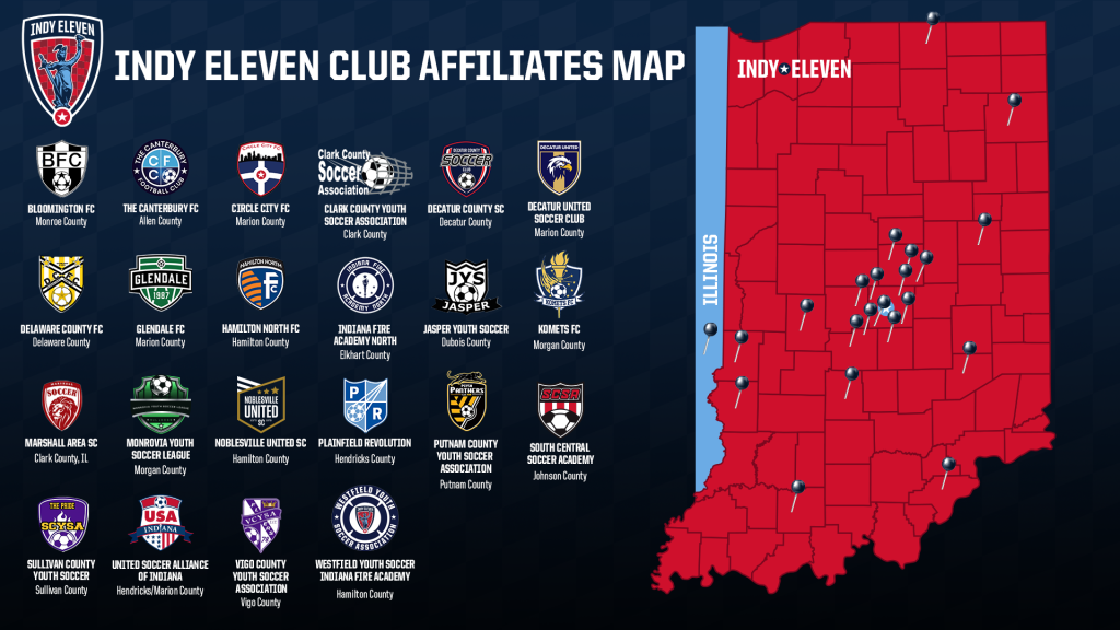 This program, presented by Allegion and Ford, is designed to support more than 18,000 rec-level players from programs across the Hoosier State and beyond. The 22 current Indy Eleven Club Affiliate Program members are listed below.