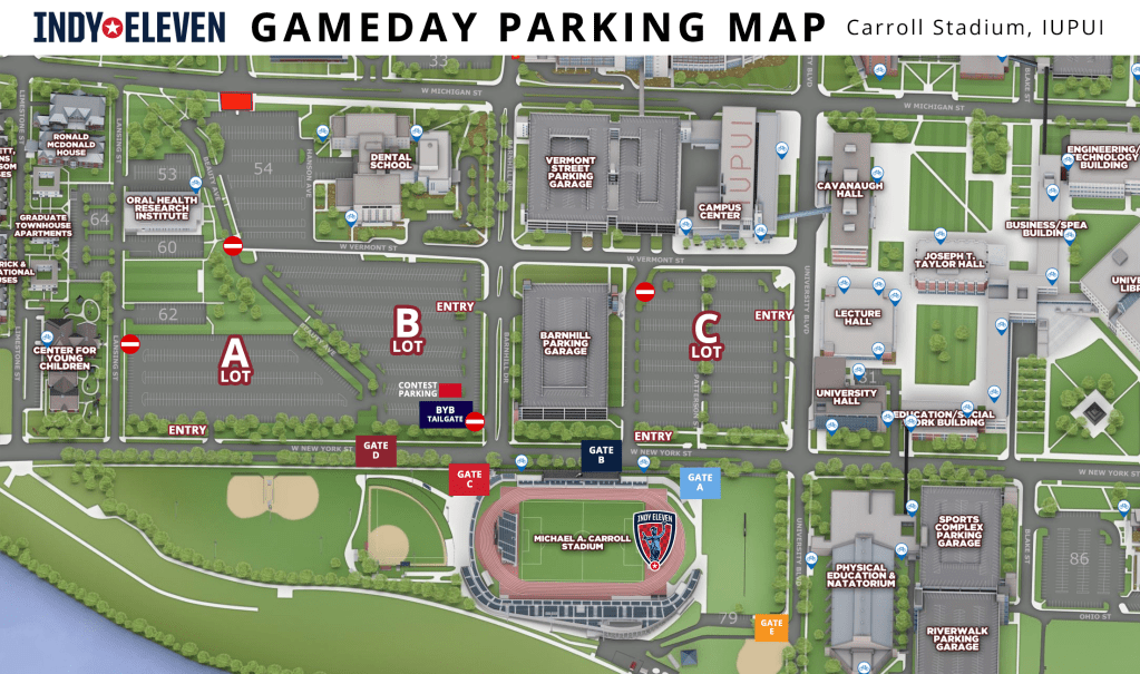 - Parking is available for Indy Eleven events at Carroll Stadium via the three surface lots location north of the stadium across New York Street; please refer to the above map for entry points into each lot.